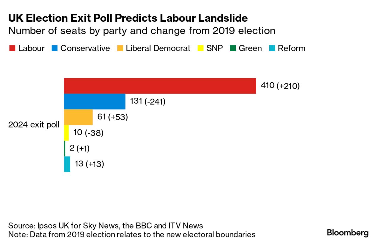 Με επικεφαλής τον Κιρ Στάρμερ, οι Εργατικοί προβλέπεται να εξασφαλίσουν 410 έδρες, έναντι 131 των Συντηρητικών. Ακολουθούν οι Φιλελεύθεροι Δημοκράτες με 61 έδρες και το Reform UK του Νάιτζελ Φάρατζ με 13. Tο Σκοτσέζικο Εθνικό Κόμμα εκτιμάται ότι θα καταλάβει 10 έδρες και οι Πράσινοι 2 έδρες.