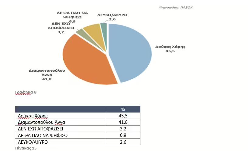 Εάν είχαμε σήμερα εκλογές και σε αυτές ψήφιζαν οι «ψηφοφόροι ΠΑΣΟΚ» κανείς δεν θα εκλεγόταν Πρόεδρος και είχαμε δεύτερο γύρο. Σε αυτόν θα περνούσαν οι κ.κ. Ανδρουλάκης και Δούκας με πολύ μικρή διαφορά (στα πλαίσια του στατιστικού σφάλματος).