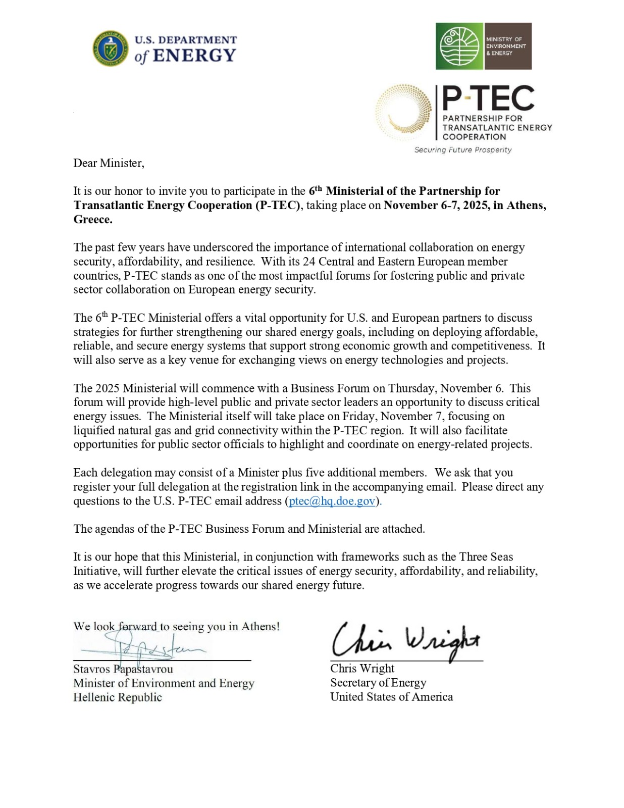 Όπως αναφέρει, η κοινή πρόσκληση που συνυπογράφουν οι κ.κ. Παπασταύρου και Wright και απευθύνεται προς τις 24 ευρωπαϊκές χώρες-μέλη του P-TEC, «η 6η Υπουργική Διάσκεψη P-TEC προσφέρει την ευκαιρία στους εταίρους των ΗΠΑ και της Ευρώπης να συζητήσουν στρατηγικές για την περαιτέρω ενίσχυση των κοινών μας ενεργειακών στόχων, συμπεριλαμβανομένης της ανάπτυξης οικονομικά προσιτών, αξιόπιστων και ασφαλών ενεργειακών συστημάτων που υποστηρίζουν ισχυρή οικονομική ανάπτυξη και ανταγωνιστικότητα. Θα λειτουργήσει επίσης ως βασική πλατφόρμα ανταλλαγής απόψεων για ενεργειακές τεχνολογίες και έργα».
