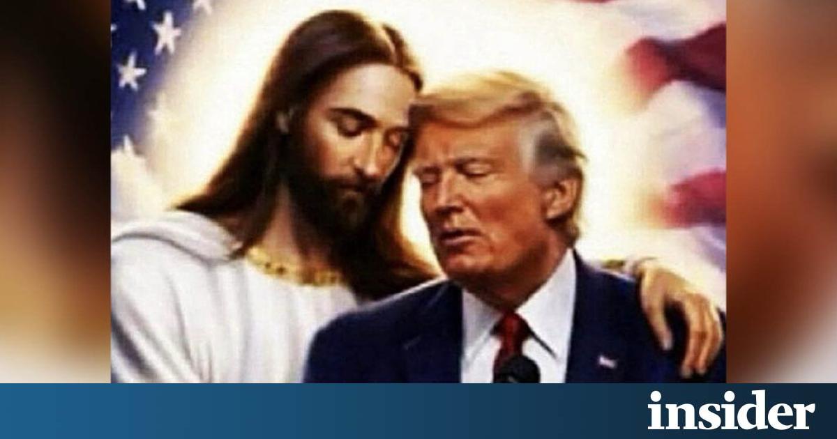 Η εικόνα, που αναδημοσιεύτηκε στον λογαριασμό του Τραμπ στο Truth Social, τον δείχνει με τα μάτια του κλειστά, να κλίνει την κεφαλή προς τον Ιησού. Ο Τραμπ στέκεται πίσω από ένα μικρόφωνο και πίσω του μια αμερικανική σημαία. Η αρχική ανάρτηση είχε τη λεζάντα: «Δεν ήμουν ποτέ ένας ιδιαίτερα θρησκευόμενος άνθρωπος... αλλά δεν φαίνεται, με όλα αυτά τα σατανικά, δαιμονικά, τέρατα που θυσιάζουν παιδιά να αποκαλύπτονται... ότι ο Θεός μπορεί να παίζει το χαρτί Τραμπ!»