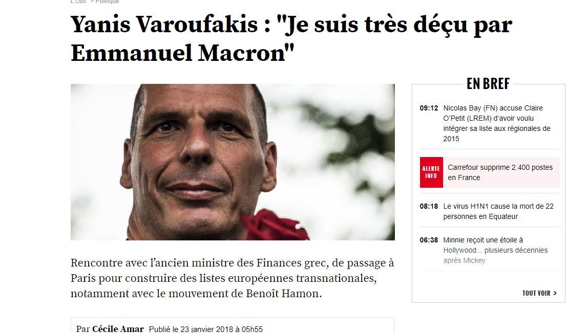 Ο κ. Βαρουφάκης στη συνέντευξη στο γαλλικό εβδομαδιαίο περιοδικό δηλώνει «απογοητευμένος» από τον Εμανουέλ Μακρόν.