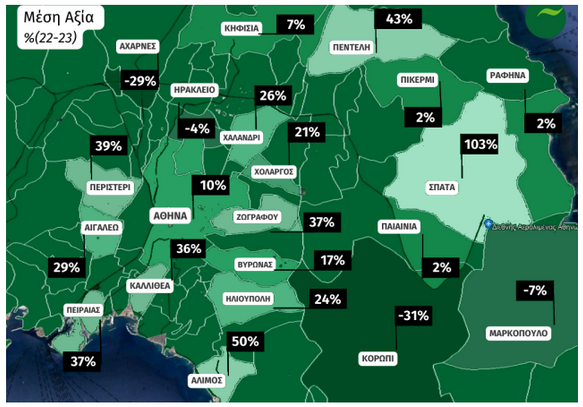 Το 2023 παρατηρείται εκτόξευση στην συνολική αξία των αγοραπωλησιών στις περιοχές του Πειραιά, και της Δυτικής Αθήνας και Αττικής, ενώ μεγάλες αυξήσεις συνεχίζονται στις περιοχές που οδηγούσαν τόσα χρόνια την αγορά κατοικιών, δηλαδή το κέντρο της Αθήνας, τα Νότια και τα Βόρεια Προάστια.