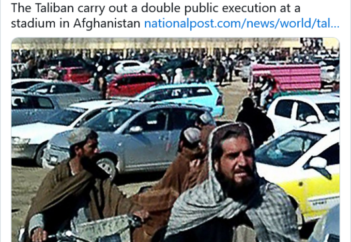 Στο κατάμεστο στάδιο του Σεμπεργκάν, έγινε χθες άλλη μια δημόσια εκτέλεση ενός άνδρα που κρίθηκε ένοχος για φόνο. Ο καταδικασμένος Νάζαρ Μουχάμαντ εκτελέστηκε με πέντε σφαίρες μπροστά στα μάτια της οικογένειας του θύματός του και χιλιάδων άλλων που είχαν συγκεντρωθεί στο στάδιο, για να δουν το θέαμα. Όπως είναι γνωστό, ο ηγέτης του Αφγανιστάν Χαϊμπατουλάχ Αχουντζάντα είχε ζητήσει από τους δικαστές να εφαρμόζουν όλες τις προβλέψεις της σαρία, κυρίως σε ό,τι αφορά τις δημόσιες εκτελέσεις σε περιπτώσεις καταδίκης για φόνο, αλλά και τις σωματικές τιμωρίες (λιθοβολισμός, μαστιγώσεις και ακρωτηριασμοί) για διάφορα άλλα παραπτώματα (πχ αν οι γυναίκες δεν καλύπτουν σωστά το σώμα τους, σύμφωνα με τις επιταγές των Ταλιμπάν).