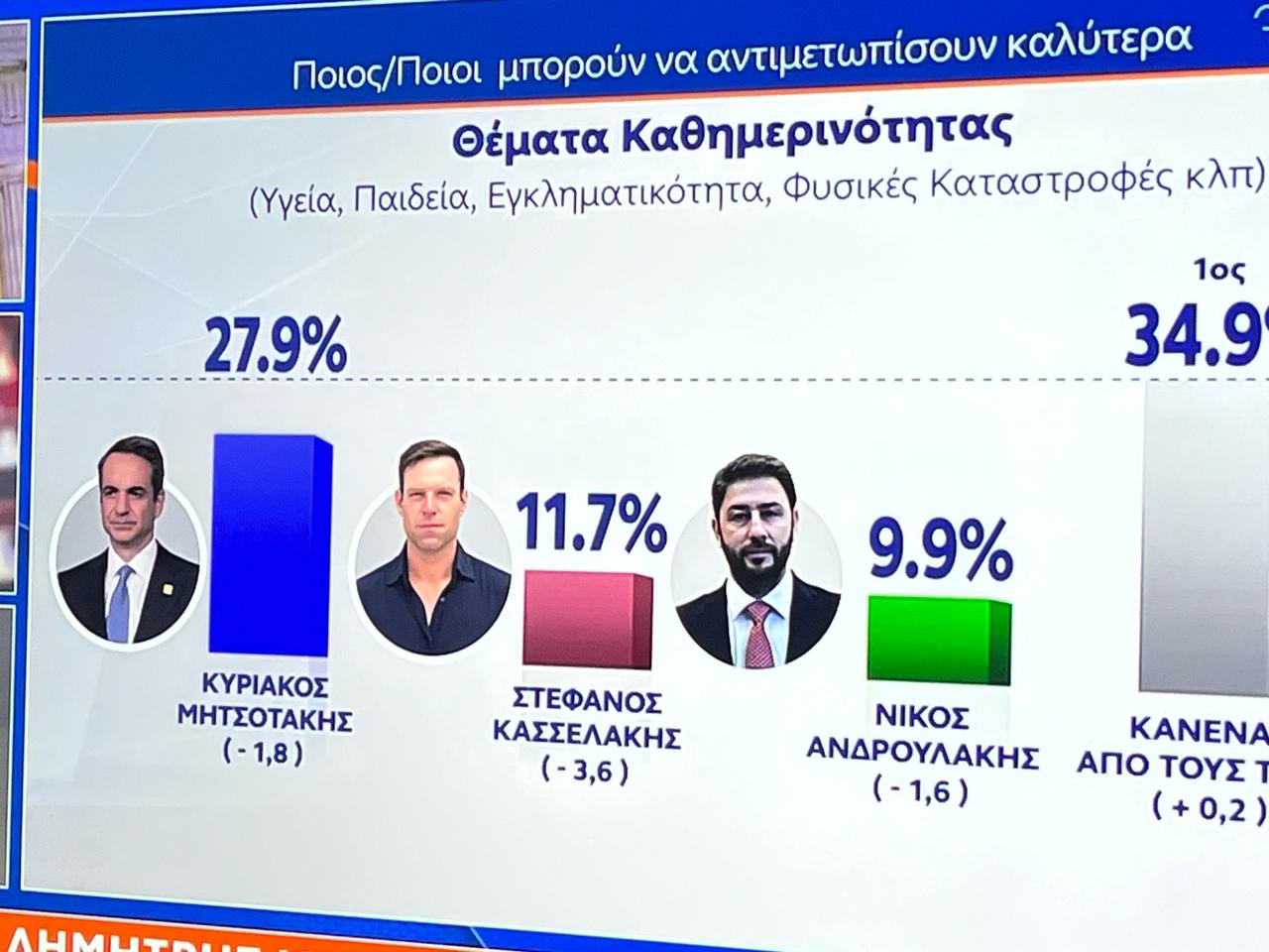 Την ώρα που Βελόπουλος, Κουτσούμπας, Ευκλείδης και Λατινοπούλου χαμογελούν, σκεπτικισμός υπάρχει στο Πασοκ, καθώς το ελατήριο δεν λέει να εκτιναχθεί. Στην MRB και στην ερώτηση «ποιος μπορεί να αντιμετωπίσει καλύτερα θέματα καθημερινότητας» είναι εκπληκτικό ότι ο Κασσελάκης, είναι μπροστά από τον Ανδρουλάκη.