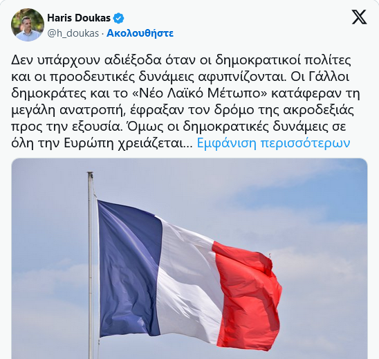 Προβολή κρυφών και φανερών επιθυμιών κρύβουν οι αντιδράσεις εγχώριων πολιτικών δυνάμεων στον χώρο της κεντροαριστεράς, μετά το κλείσιμο της κάλπης στην Γαλλία. Ο Πρόεδρος Κασσελάκης, ενώ μια μέρα πριν απέρριπτε την πρόταση των «87» να γίνει δημοψήφισμα στην βάση με ερώτημα την συμπόρευση με άλλες δυνάμεις για δημιουργία μετώπου, έκανε την εξής ανάρτηση: