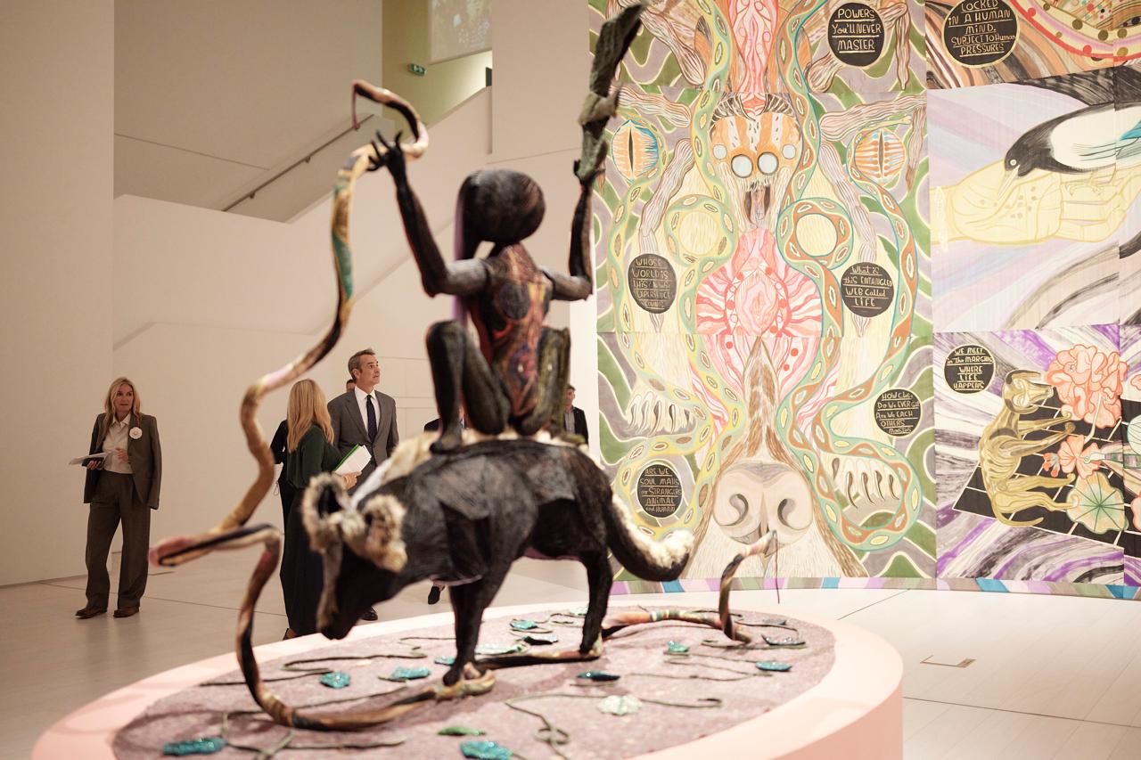 Μετά την Εθνική Πινακοθήκη, Κυριάκος και Μαρέβα συνέχισαν τη βραδιά στο ίδιο κλίμα. Η υπουργός Πολιτισμού Λίνα Μενδώνη και η Καλλιτεχνική Διευθύντρια του ΕΜΣΤ Κατερίνα Γρέγου, τους ξενάγησαν στην έκθεση «Why Look at Animals? A case for the Rights of Non-Human Lives”.