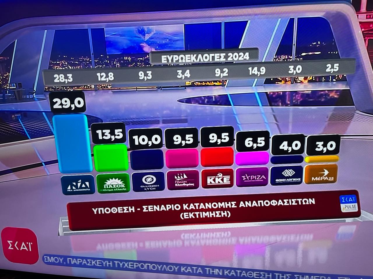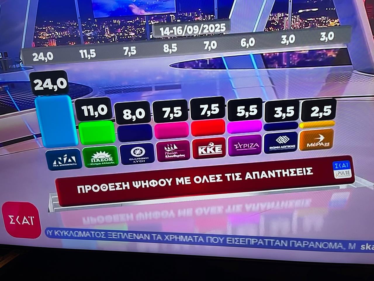 Πάντως στη χθεσινή Pulse του Γιώργου Αράπογλου για τον ΣΚΑΪ η ΝΔ εξακολουθεί να κρατάει διπλάσια διαφορά στην πρόθεση ψήφου από το δεύτερο ΠΑΣΟΚ-ΚΙΝΑΛ,