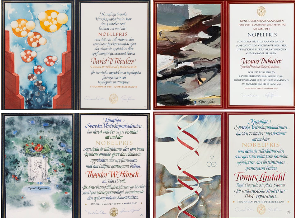 Τα διπλώματα φυσικής τοποθετούνται σε σκούρο μπλε δερμάτινο κάλυμμα, της χημείας σε κόκκινο, της ιατρικής σε μπορντό, των οικονομικών επιστημών σε σκούρο καφέ και της λογοτεχνίας σε μπλε. Επιπλέον, οι καλλιγράφοι έχουν σχεδιάσει ειδικά χρυσά μονογράμματα για κάθε έναν από τους βραβευθέντες στην εξωτερική πλευρά των διπλωμάτων. Είναι όλα κατασκευασμένα από γκρι υφασμάτινο χαρτόνι, επενδυμένα εσωτερικά με σουέτ από χοιρινό δέρμα ενώ το μέγεθός του είναι 23 x 35 εκατοστά.