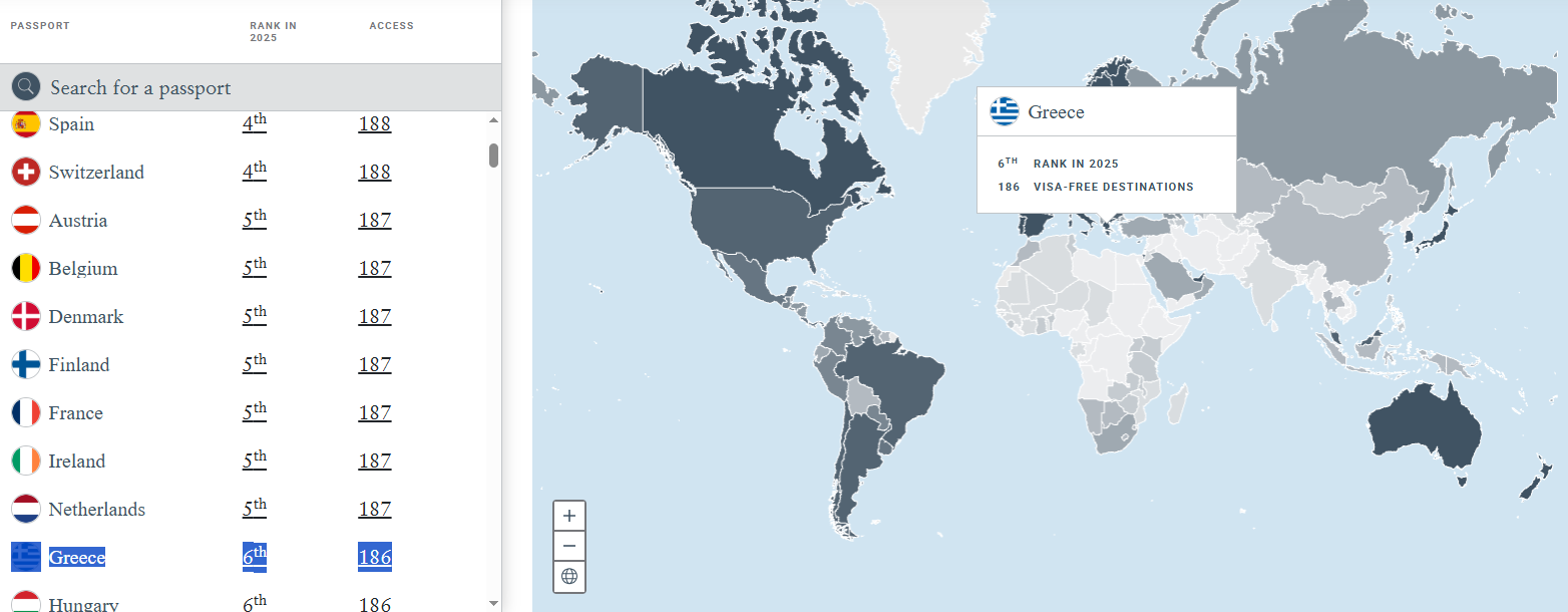 Αντιθέτως, η Ελλάδα είναι στην 6η θέση και ισοβαθμεί με Ουγγαρία, Νέα Ζηλανδία, Νορβηγία, Πορτογαλία και Σουηδία καθώς οι κάτοχοι ταξιδιωτικών εγγράφων των εν λόγω χωρών απολαμβάνουν πρόσβαση χωρίς βίζα σε 186 προορισμούς παγκοσμίως. Στην κορυφή παραμένει το διαβατήριο της Σιγκαπούρης, προσφέροντας ελεύθερη πρόσβαση σε 193 χώρες και περιοχές. Ακολουθεί η Νότια Κορέα με 190 προορισμούς, με το «χάλκινο» να λαμβάνει η Ιαπωνία, με δυνατότητα ταξιδιού χωρίς βίζα σε 189 χώρες.