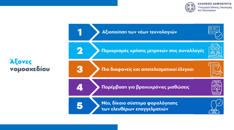 Σύμφωνα με τον υφυπουργό Οικονομικών Χάρη Θεοχάρη το νομοσχέδιο έχει ένα χαρακτήρα ολιστικής αντιμετώπισης της φοροδιαφυγής και λαμβάνονται 4 πρωτοβουλίες για τη μείωση της χρήσης των μετρητών: