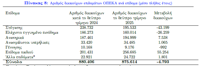 Μικρή αύξηση σημειώθηκε επίσης στο επίδομα γέννησης (κατά 2 εκατ. ευρώ) με τον μέσο όρο των δικαιούχων του εν λόγω επιδόματος να μειώνεται κατά 992 σε σχέση με το δεύτερο τρίμηνο του 2024, αγγίζοντας κατά μέσο όρο τους 9.176 δικαιούχους το 2025.
