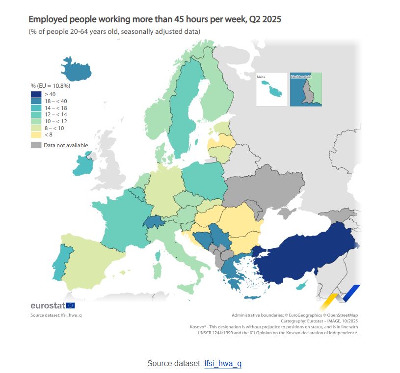 Ολοένα και αυξάνονται οι ώρες απασχόλησης όσων εργάζονται σε χώρες της Ευρωπαϊκής Ένωσης, με τους Έλληνες μάλιστα εργαζόμενους να κατακτούν την κορυφή, όπως αποκαλύπτουν τα στοιχεία που δημοσίευσε η Eurostat για το δεύτερο τρίμηνο του 2025