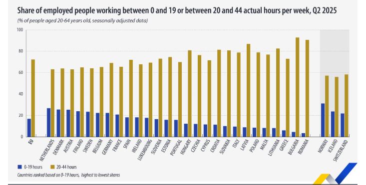 Σε επίπεδο ΕΕ, το 16,9% των απασχολούμενων ηλικίας 20-64 ετών εργάζονταν έως και 19 ώρες την εβδομάδα. Τα υψηλότερα ποσοστά σε αυτήν την κατηγορία παρατηρήθηκαν στην Ολλανδία (26,8%), τη Δανία (25,5%) και την Αυστρία (25,3%). Αντίθετα, τα μικρότερα ήταν στη Ρουμανία (3,5%), τη Βουλγαρία (4,6%) και την Ελλάδα (6,1%).