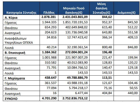 Σύμφωνα με τα στοιχεία του πληροφοριακού συστήματος «Ήλιος» για τον μήνα Αύγουστο 2025, πληρώθηκαν συνολικά 4.701.290 συντάξεις, από τις οποίες οι 2.878.281 ήταν κύριες, οι 1.384.362 επικουρικές και 438.647 μερίσματα. Η μηνιαία δαπάνη που κατέβαλλαν τα ταμεία ανήλθε σε 2.752.836.753,12€ και περιλαμβάνει τις κρατήσεις φόρου, τις κρατήσεις υπέρ υγείας και ΑΚΑΓΕ.