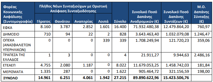 Σύμφωνα με τα στοιχεία του Αυγούστου, η συνολική δαπάνη των αναδρομικών στους νέους συνταξιούχους με οριστική απόφαση συνταξιοδότησης ανήλθε σε 89.890.622,96€ και η συνολική δαπάνη συντάξεων σε 15.423.506,76€ για την πληρωμή 27.215 συντάξεων.
