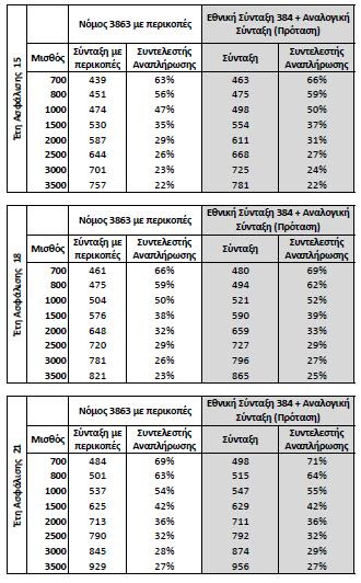 Από τα παραδείγματα φαίνεται πως όσο αυξάνονται τα έτη ασφάλισης για τη χορήγηση σύνταξης, τόσο οι συντάξεις μικραίνουν. Συγκεκριμένα στη 15αετία, το ν/σ Κατρούγκαλου παρέχει υψηλότερες συντάξεις, περίπου 25 ευρώ ανά περίπτωση, ενώ με 18 έτη οι αυξήσεις που παρατηρούνται είναι της τάξης των 20 ευρώ και με 21 έτη ασφάλισης, από 2 έως 29 ευρώ.