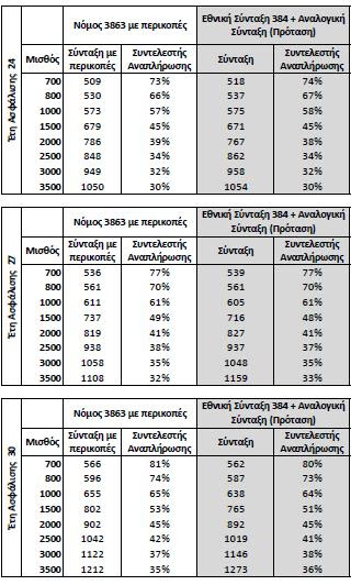 Στα 30 έτη διαπιστώνονται μόνο μειώσεις στις συντάξεις έως 27 ευρώ. Τα ποσοστά αναπλήρωσης ξεκινούν από το 22% για εισόδημα 3.500 ευρώ με 15αετία, και φτάνουν στο 80% για μισθό 700 ευρώ, με 30 έτη ασφάλισης.