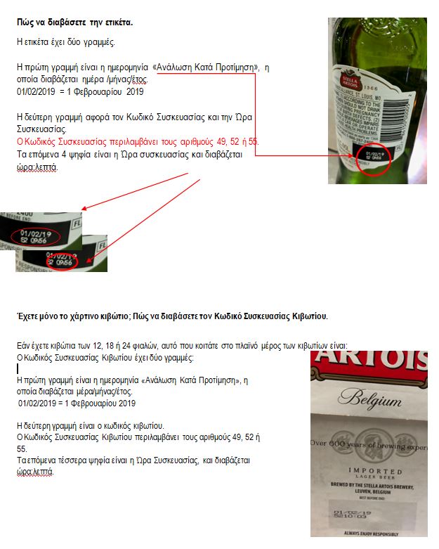 Η ανάκληση αφορά συσκευασίες 24 φιαλών 33 εκατοστόλιτρων της Stella Artois στην Ελλάδα με ημερομηνία ελάχιστης διατηρησιμότητας 14/02/19, 15/02/19, 24/01/19 και 25/01/19.