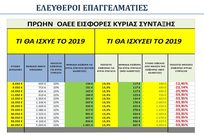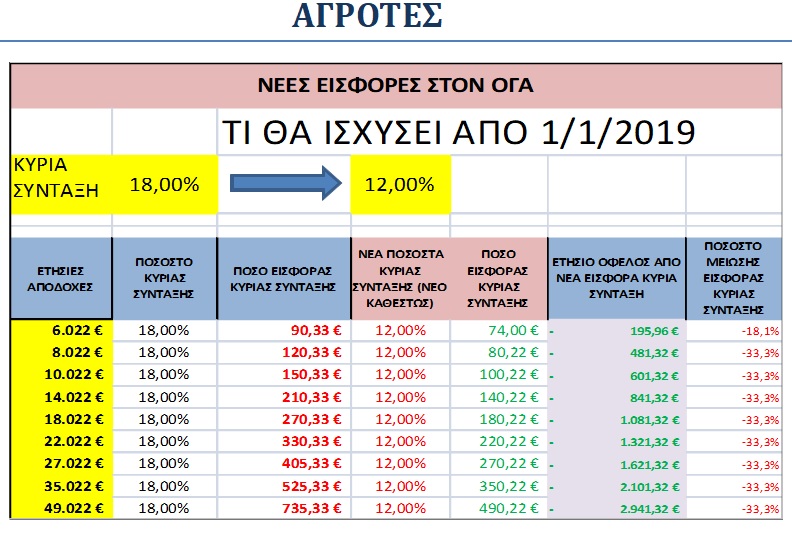 Η ελάφρυνση φτάνει στο 33,3% για ελεύθερους επαγγελματίες (ΟΑΕΕ) και αγρότες (ΟΓΑ). Ειδικά για τους αγρότες το ασφάλιστρο της κύριας σύνταξης πέφτει στο 12% το 2019.