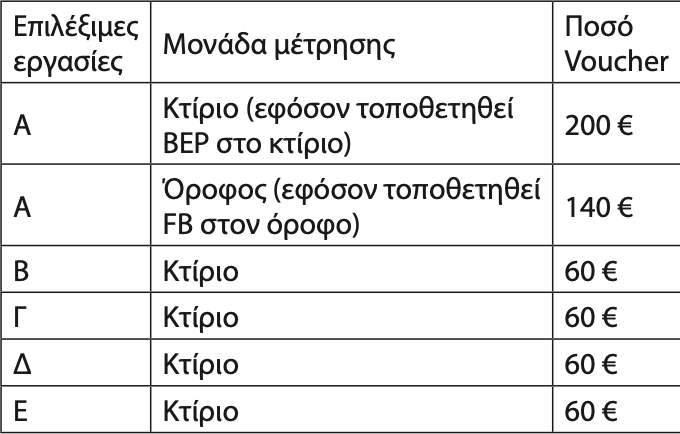 Να θυμίσουμε ότι το συνολικό ποσό του Voucher ανά κτίριο προκύπτει με βάση τις κατηγορίες των εργασιών που θα πραγματοποιηθούν (υποχρεωτικά εργασίες που αντι- στοιχούν στο στοιχείο Α και, επιπλέον, τουλάχιστον μία από τις εργασίες που αντιστοιχούν σε οποιοδήποτε εκ των στοιχείων Β έως Ε). Πιο συγκεκριμένα, το ποσό του Voucher καθορίζεται ως ακολούθως: