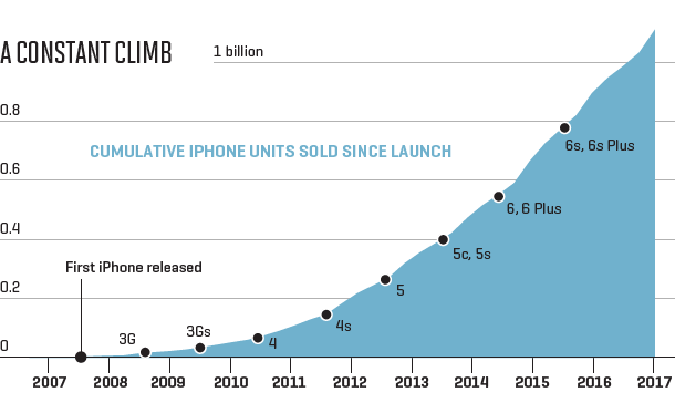 Ενδεικτικά σύμφωνα με τα όσα ανακοίνωσε η Apple πούλησε 50,8 εκατομμύρια iPhones το πρώτο τρίμηνο του 2017, 1% λιγότερα σε σχέση με την αντίστοιχη περυσινή περίοδο - ο επικεφαλής της Apple Tim Cook απέδωσε την εξέλιξη αυτή στο γεγονός ότι οι πελάτες αναμένουν το επόμενο iPhone. Παράλληλα βέβαια η Apple ανακοίνωσε αύξηση των εσόδων της κατά 4,6% στα 52,9 δισεκατομμύρια δολάρια, ελαφρώς χαμηλότερα από τις προβλέψεις των αναλυτών. Παρότι μειώθηκε ο αριθμός των τεμαχίων που πουλήθηκαν, συγκεκριμένα τα έσοδα από τα iPhones αυξήθηκαν κατά 1% στα 33,2 δισεκατομμύρια δολάρια χάρη στις «ισχυρές» πωλήσεις του ακριβότερου iPhone 7 Plus.