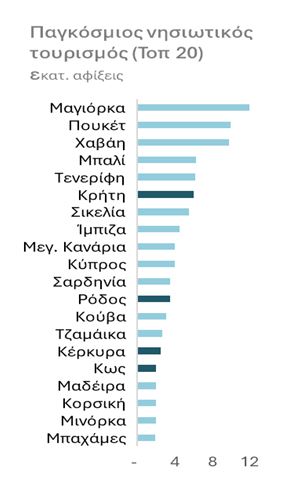 Η Ελλάδα είναι ένας κατεξοχήν νησιωτικός τουριστικός προορισμός, με τα νησιά της να έχουν επιτύχει διπλασιασμό αφίξεων την τελευταία 15ετία, φθάνοντας τα 16 εκατ. το 2024. Εντυπωσιακό είναι το γεγονός ότι ξεχωρίζουν σε παγκόσμιο επίπεδο, καλύπτοντας το 11% του παγκόσμιου νησιωτικού τουρισμού, ενώ 7 ελληνικά νησιά συγκαταλέγονται στη λίστα των 30 πιο δημοφιλών προορισμών παγκοσμίως (αντίστοιχα με εμβληματικά νησιά όπως το Μπαλί και η Χαβάη). Αυτή η δυναμική, ωστόσο, συνοδεύεται από εντεινόμενες πιέσεις στις υποδομές: κατά τους μήνες αιχμής, η τουριστική πυκνότητα φθάνει τους 33 επισκέπτες ανά km² ημερησίως, έναντι μόλις 2–3 στην υπόλοιπη Ελλάδα και τη Μεσόγειο. Παρά αυτή την εκρηκτική εποχική αύξηση των αναγκών, οι επενδύσεις υποδομών ανά κάτοικο την τελευταία 20ετία παρέμειναν αντίστοιχες με εκείνες της ενδοχώρας, παρότι οι νησιωτικές περιοχές αντιμετωπίζουν σημαντικές ιδιαιτερότητες. Καταρχάς, ο πληθυσμός στα νησιά αυξάνεται κατά μέσο όρο κατά 50% σε σχέση με τον μόνιμο (φθάνοντας κατά περίπτωση ακόμη και πάνω από 100%), γεγονός που ασκεί πολύ πιο έντονες πιέσεις στις υποδομές τους. Στην ηπειρωτική χώρα, παρότι εντοπίζονται μεμονωμένες εστίες (όπως π.χ. η Χαλκιδική όπου η προσαύξηση προσεγγίζει το 50%), το φαινόμενο παραμένει πιο περιορισμένο, με τη μέση αύξηση να μην υπερβαίνει το 5%. Κατά δεύτερο, τα νησιά επιβαρύνονται με πρόσθετα κόστη της τάξης του 15%, λόγω αυξημένων logistics, έλλειψης οικονομιών κλίμακας και ανάγκης για εφεδρείες σε απομονωμένες περιοχές. Χωρίς στοχευμένη αναβάθμιση υποδομών, η τουριστική ανάπτυξη των νησιών κινδυνεύει να παγιδευτεί στα όριά της.