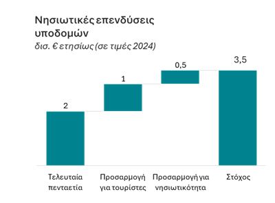 Συγκεκριμένα, σύμφωνα με τις εκτιμήσεις μας, για να ανταποκριθούν οι νησιωτικές οικονομίες στις αυξημένες ανάγκες, θα πρέπει στις σημερινές ετήσιες επενδύσεις - που ανέρχονται περίπου σε €2 δισ. και αφορούν κυρίως έργα μεταφορών και βασικές υποδομές (όπως ενέργεια και ύδρευση) - να προστεθούν επιπλέον: (i) περίπου €1 δισ. ετησίως για την κάλυψη της εποχικής αύξησης του πληθυσμού κατά 50%, και (ii) ακόμη €0,5 δισ. για την αντιμετώπιση της πρόσθετης «νησιωτικής επιβάρυνσης» που εκτιμάται σε περίπου 15%. Συνολικά, η απαιτούμενη επενδυτική προσπάθεια ανέρχεται σε περίπου €3,5 δισ. ετησίως ή €35 δισ. έως το 2035 - προϋπόθεση για να απορροφηθεί η αυξανόμενη ζήτηση (χωρίς να διαρραγεί η φέρουσα ικανότητα) και να ενισχυθεί η παραγωγική βάση των νησιωτικών οικονομιών.