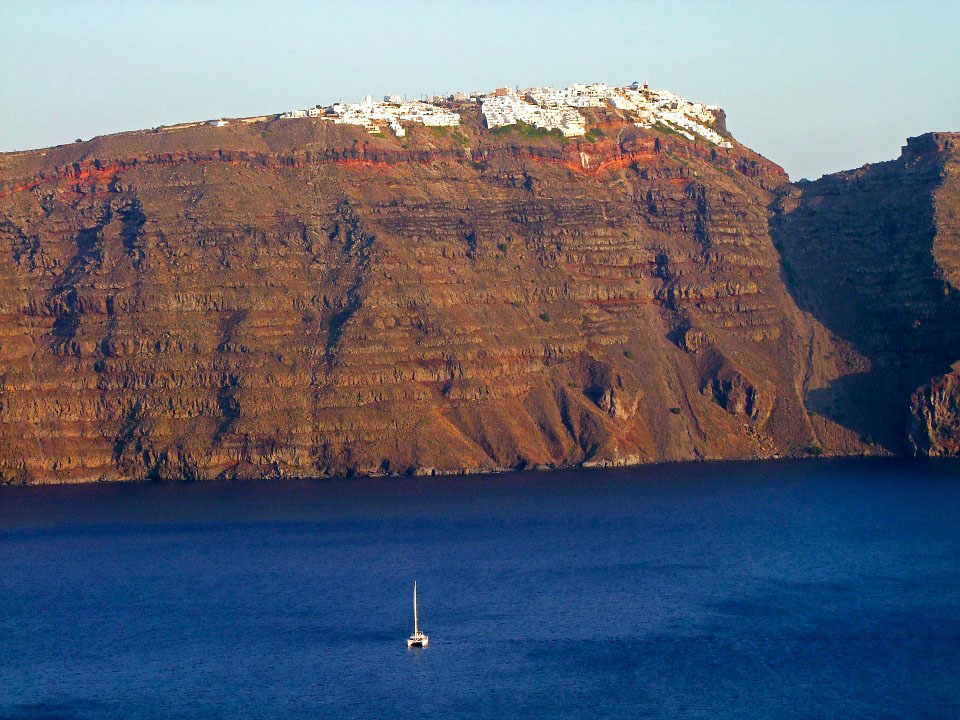 Ο καλύτερος τρόπος να την προσεγγίσεις είναι από τη θάλασσα. Η πρώτη φορά που βλέπει ο επισκέπτης την Καλντέρα καθώς πλησιάζει στο λιμάνι είναι ένα θέαμα που όμοιό του δεν υπάρχει στη Μεσόγειο. Αλλά και η θέα από την Καλντέρα προς τη θάλασσα είναι μοναδική, όπως και από το κάστρο της Οίας, με το παγκοσμίου φήμης ηλιοβασίλεμα. Η Σαντορίνη είναι ένα νησί που ικανοποιεί όλες τις αισθήσεις.