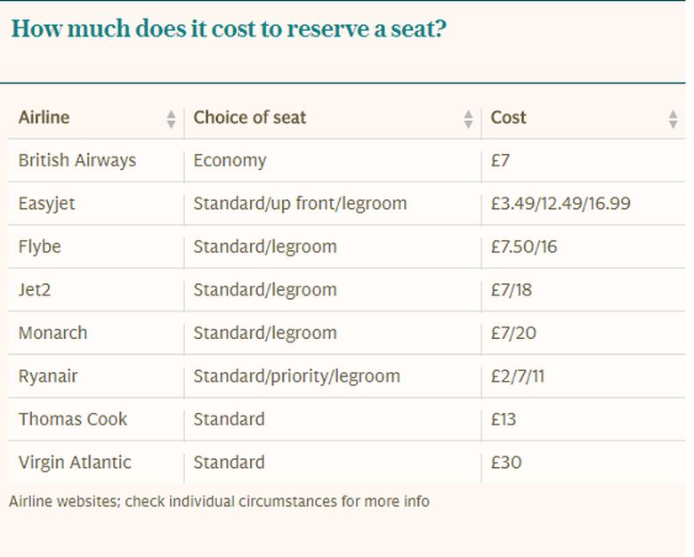 Όσο για τις άλλες αεροπορικές εταιρείες η επιλογή καθίσματος κυμαίνεται από 4 λίρες έως και 15 λίρες (4 έως 16,50 ευρώ). Στην περίπτωση της Thomas Cook 13 λίρες, 7 λίρες στην περίπτωση της British Airways και 10,55 λίρες στην περίπτωση της Flybe. Η Virgin Atlantic χρεώνει την επιλογή καθίσματος 331 ημέρες πριν από τα πτήση με 30 λίρες για κάθε διαδρομή. Σύμφωνα με το Kayak όλες οι τιμές είναι ακριβείς αφού λαμβάνονται από τις ιστοσελίδες των αεροπορικών εταιρειών.